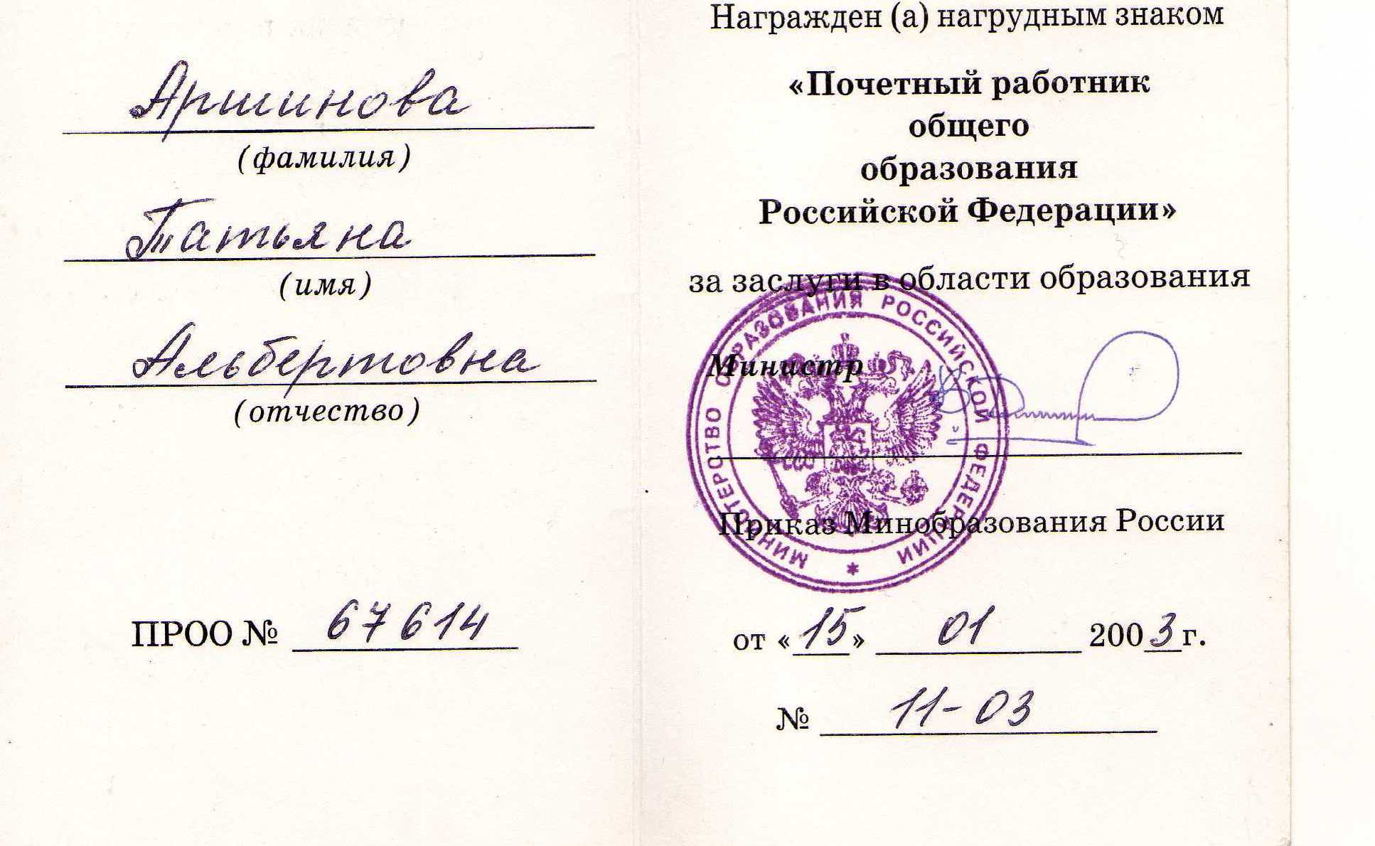 Аршинова Т.А. - почетный работник общего образования РФ